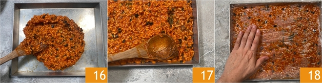 Transfer the rice to a large enough baking dish 16, spread it well to get a layer that is not too thick 17. Cover it with cling film in contact 18, let it return to room temperature, then let it set in the refrigerator for at least two hours.