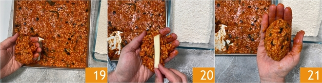 After this time, take the set rice, with wet hands take a portion of rice and fill it with a slice of smoked scamorza 20. Always with wet hands, close each supplì well, trying not to let the scamorza escape 21.