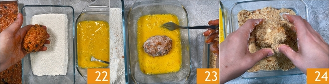Take care of the breading of the supplì: first pass them in the flour 22, then in the beaten eggs 23, and finally in the breadcrumbs 34.