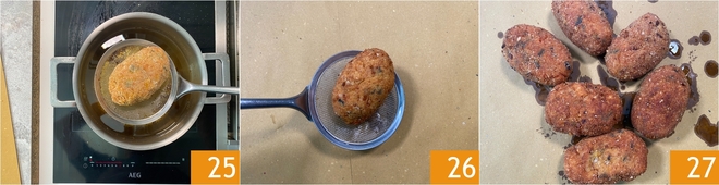 Heat the seed oil to 320 degrees Fahrenheit and fry one supplì at a time 25 for about three minutes. When it is nicely golden and crispy, drain it on paper towels 26, continue this way with all the other supplì 27, and serve them hot!