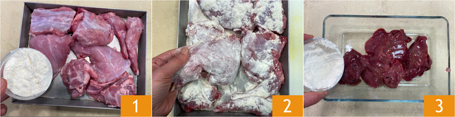 To make the tagliolini with rabbit ragu and mushrooms, first prepare the Vegetable broth (or meat broth) and keep it warm. Flour the rabbit pieces 1 and remove the excess flour 2. Do the same with the liver 3.
