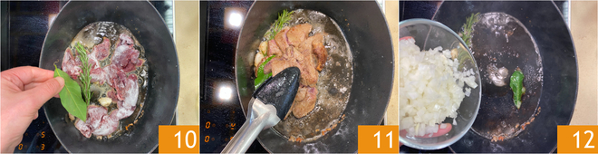 Flavor with rosemary and bay leaf 10 and brown well, then also remove the liver from the pot 11 and set it aside. It's important that the cooking base does not burn. At this point, add the chopped onion to the pot 12.