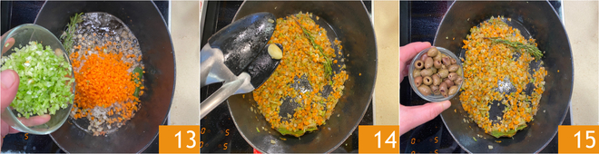 Also add the previously chopped carrot and celery 13, then let them sauté over low heat for about ten minutes. When the vegetables have softened, remove the garlic 14 and add the Taggiasca olives 15.