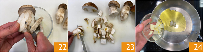 In the meantime, take care of the mushrooms: clean the porcini by removing the earthy part of the stem 22, then cut them into cubes of about 3/4 inch 23. Set half a porcini aside to add raw to the finished dish. In a pan, melt the butter with the oil and 2 cloves of garlic 34.