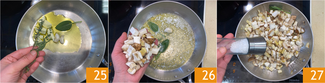 Flavor with thyme and sage 25, then add the mushrooms 26 and salt 27. Sauté over high heat for about 3 minutes.