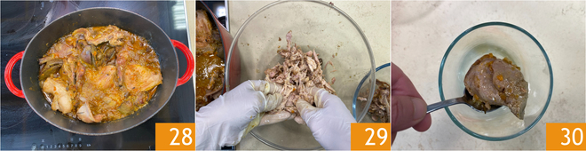 After the rabbit's cooking time has passed 28, adjust the salt. Take the meat from the pot and shred it with your hands, making sure to remove all the small bones 29. Set the shredded meat aside and place the previously browned liver in a beaker 30.