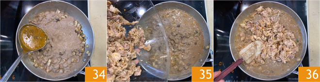 Also pour in a ladle of the rabbit's cooking base 34 and mix well, then add the shredded meat 35 and briefly blend everything over low heat 36.