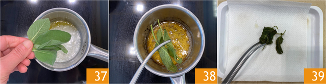 While you bring the water to a boil for cooking the pasta, take care of the crispy sage: melt the butter in a small pan, add the sage leaves 37 and sauté them for 3-4 minutes 38 until they become nice and crispy. Transfer them to absorbent paper 39 and set aside.