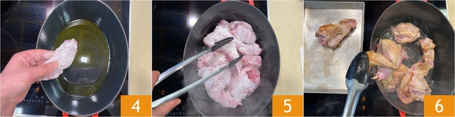 In a cast iron pot, heat the oil and place the floured rabbit pieces 4. Brown the meat on all sides for 6-7 minutes over high heat, it should not over-brown 5. If it starts to color too much, lower the flame. Once browned, remove the rabbit from the pot and set it aside 6.