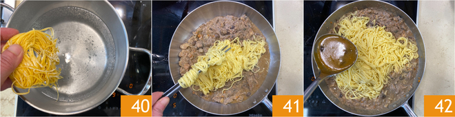 Salt the boiling water and cook the tagliolini 40. As soon as they rise to the surface, drain the tagliolini into the pan with the sauce 41 and moisten with a ladle of the rabbit's cooking base 42. Mix briefly and turn off the heat.