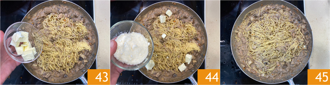 Toss with the butter 43 and grated Parmigiano Reggiano 44 and mix everything together 45.
