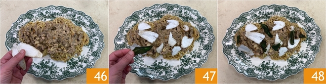 Plate the tagliolini and garnish with the raw porcini set aside, cut into slices 46, then complete with the crispy sage leaves 47. Your tagliolini with rabbit ragu and mushrooms are ready to be served 48!
