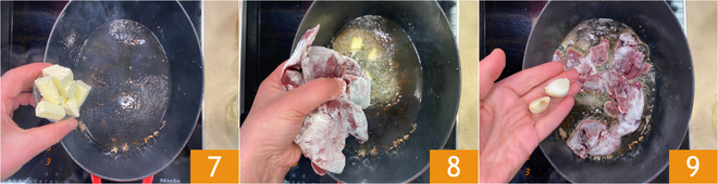 In the same pot, add the butter 7, the floured liver 8, and a clove of garlic 3.