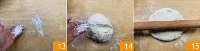 After the rising time, lightly flour both the work surface 13 and the dough 14 and begin to roll it out with the help of a rolling pin 15. If it retracts a lot while rolling, wait a few more minutes to allow the dough to relax.