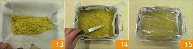 As soon as the mixture is nice and dry, transfer to a rectangular baking pan lined with parchment paper 13. Level the surface with a spatula or the back of a spoon 14 and cover with plastic wrap or parchment paper. Let this set in the freezer for 10-12 hours 15.