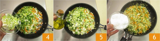 Now add the celery and leek 4. Pour over the oil 5 and cook for about 15 minutes. At this point, add the fine salt 6.