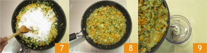 Continue to cook for around 5-6 minutes, stirring every so often 7. Now that the vegetables are soft and full of flavor 8, transfer them to a food processor 9.