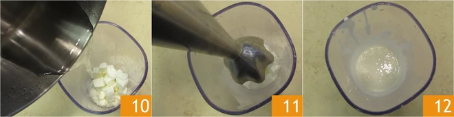 Place the feta in a tall and narrow container, add the hot water 10 and blend with an immersion mixer 11 into a smooth and homogeneous cream 12.