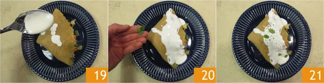 You are ready to assemble the crepes: cover a quarter of the surface with the filling 16, then fold in half 17 and lastly, into a triangle 18. Proceed to fill the other crepes in exactly the same way.