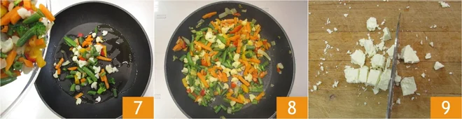 Prepare the filling in the meantime: heat a non-stick pan with a drizzle of oil, add the vegetables 7 and sauté on a high flame for 7 minutes 8, then add salt and leave to cool. Now dice the feta 9 and heat the water to around 158°.