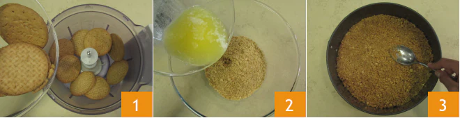 To make the yogurt, fig, and honey cheesecake, start with the cheesecake base: melt the butter over very low heat and let it cool. Pour the cookies into a mixer 1 and blend them. Add the previously melted butter to the cookies 2 and mix well to combine. Use the combined mixture to cover the base of a 9.5-inch diameter pan lined with parchment paper. Press well with the back of a spoon to have an even thickness 3 and place in the refrigerator to set for about 30 minutes.
