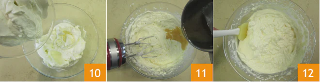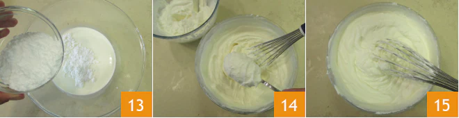 Pour the cream into another bowl, add the powdered sugar 13, and whisk to a firm and frothy consistency. Combine the whipped cream with the yogurt and cheese mixture 14 and mix well with a whisk (or spatula) 15.