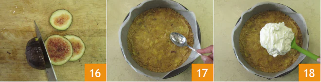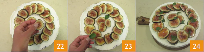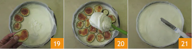 Place the fig slices all over the surface 19 and cover with the remaining cream 20. Level with the spatula 21 and place in the refrigerator to set for at least 4-6 hours.