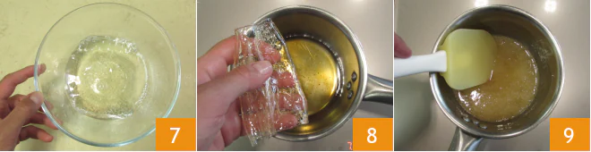 Now prepare the cream: soak the gelatin in cold water for about 10 minutes 7 while heating the honey in a small pot. When the honey approaches boiling, turn off the heat and add the well-drained gelatin 8, then mix quickly to combine 9 and let it cool.
