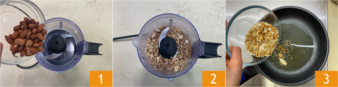 To prepare the zucchini and potato cream soup, first place the almonds in a food processor 1, then quickly blend them to chop them coarsely 2. In a pan, pour the oil, add the garlic, and let it flavor for a few minutes. Add the breadcrumbs 3 and toast over medium heat until golden.