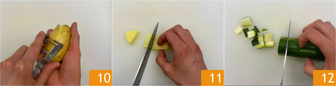 Peel the potatoes 10 and cut them first into slices, then into cubes of about 0.4 inches 11. Trim the zucchini and cut them first into slices, then into cubes 12.