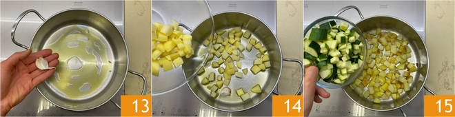 In a pot, pour the oil and garlic 13, heat for a few minutes, then add the potatoes 14 and sauté for 10 minutes. At this point, add the zucchini 15.