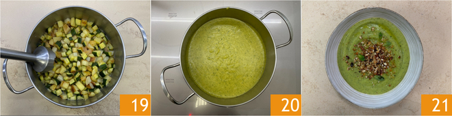Blend everything with an immersion blender 19 to obtain a creamy consistency 20. Plate and garnish with breadcrumbs and almonds. The zucchini and potato cream soup is ready to be enjoyed 21!