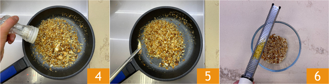 Season with salt 4, remove the garlic 5, and transfer everything to a bowl, then let it cool. Flavor the breadcrumbs with lemon zest 6.