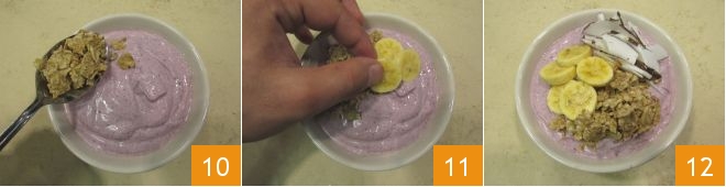 Distribute the cornflakes over the yogurt 10 and finally decorate with banana slices 11 and coconut flakes: your acai bowl is ready to be enjoyed 12!