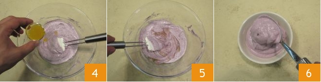 To prepare the acai bowl, first pour the Greek yogurt into a bowl along with the coconut milk 1, then add the acai powder 2 and mix well until you get a uniform color 3.