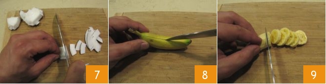 Now slice the fresh coconut into flakes 7, then peel the banana 8 and cut it into slices about half a centimeter (approx. 1/4 inch) thick 9.
