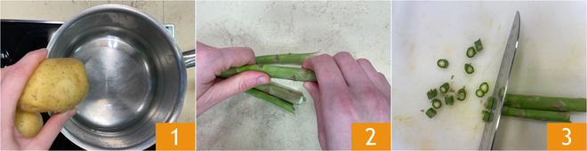 To prepare the agretti, asparagus and zucchini balls, first immerse the potatoes in cold water 1 and cook for about 30–40 minutes from the boil, until tender. Meanwhile, clean the vegetables: remove the tough end of the asparagus stalks 2 and slice them into rounds 3.