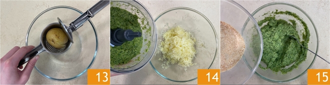 After the cooking time, drain the potatoes and mash them in a bowl 13. Add the vegetable purée 14 and the breadcrumbs 15.