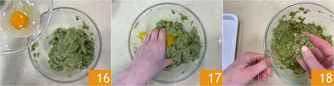 Add the egg 16 and a pinch of salt, then mix with your hands to combine the mixture 17. If it turns out too soft, you can adjust the texture with more breadcrumbs or grated cheese. Take about 25 g (about 1 oz) of mixture at a time 18.