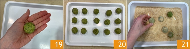 Form balls about 5 cm in diameter (about 2 inches) 19 and place them on a tray as you go; with these quantities you will get about 30 20. After forming all the balls, roll them in breadcrumbs to coat evenly 21.