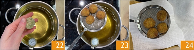 At this point, heat the vegetable oil to 356°F. Immerse a few balls at a time 22 and fry for 2–3 minutes. When they are nicely golden, drain 23 on paper towels 34.