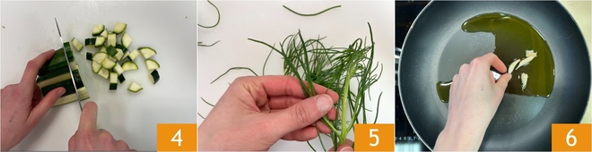 Trim the zucchini and cut them into cubes 4. Finally, remove the toughest stems from the agretti 5. In a nonstick pan, heat a drizzle of oil with the garlic to flavor it 6.