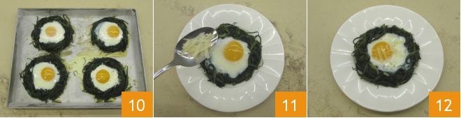 Now shape the agretti to form 4 rings on a baking sheet lined with parchment paper 7. Grate the provolone with a coarse grater and distribute it inside the nests 8, keeping some aside for the final garnish. Finally, add a whole egg to each nest, pouring it gently in the center 9. Bake in a preheated static oven at 375°F for about 10 minutes.