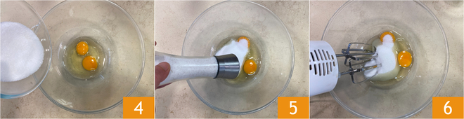 In a large bowl, pour the eggs and sugar 4, add a pinch of salt 5, and beat with electric whisks 6.