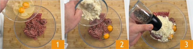 To prepare the air fryer meatballs, put the ground pork and ground beef in a bowl, then add the eggs 1, the grated Parmigiano Reggiano 2, salt and pepper 3.
