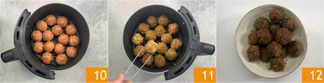Place the meatballs in the air fryer basket (we used an air fryer with a capacity of 6 liters — about 6.3 qt) 10 and cook at 392°F for 20 minutes, turning them occasionally for even cooking 11. Your air fryer meatballs are ready to enjoy 12!