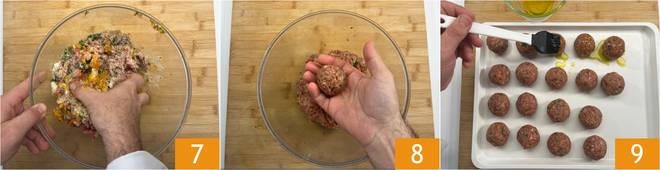 Mix the ingredients 7 until you obtain a homogeneous mixture. Cover the bowl with plastic wrap and let it rest in the refrigerator for 30 minutes. After this time, take about 1.8 oz of the mixture with damp hands and shape it into a ball 8. As you form the meatballs, place them on a tray, then brush them well with oil 9.