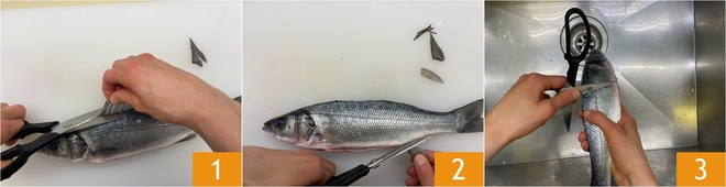 To prepare the sea bass in the air fryer, start by How to clean the seabass. Trim the lateral fins 1 and the dorsal fins 2, cut open the belly, gut it and remove the scales under running water 3.
