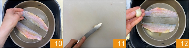 Get a tray suitable for the air fryer (capacity about 6 L, approximately 25 cups) and place 2 seasoned fillets at a time, or more depending on the size of your basket 10. Crush a clove of garlic 11 and add it to the tray 12.