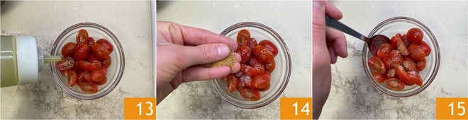 Cut the datterino cherry tomatoes and season them in a bowl with extra virgin olive oil 13, salt and muscovado sugar 14. Give them a stir to combine the ingredients well 15.